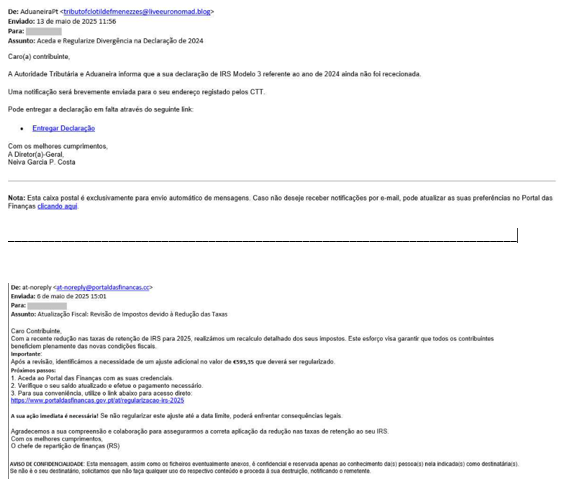 Estas mensagens são falsas e devem ser ignoradas. O seu objetivo é convencer o destinatário a aceder a páginas maliciosas carregando nos links sugeridos.